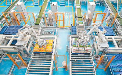 新疆天山面粉小麦食物加工产业园区,智能机器东谈主对制品面粉进行码垛。陶维明摄(影像中国)