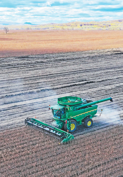 内蒙古呼伦贝尔农垦大兴安岭诺敏河农牧场亚新骰宝,连合收割机在田间收货大豆。韩颖群摄(东谈主民视觉)